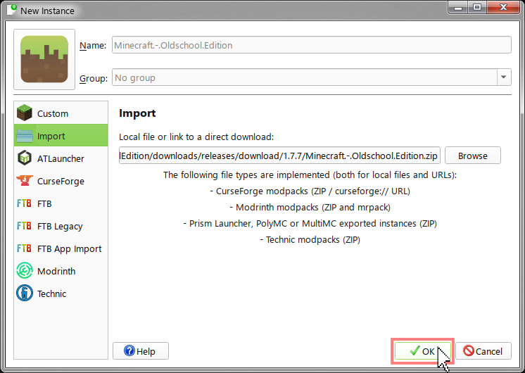 Step 2: Drag this link into the Prism Launcher window, then press ‘OK’ to import. If that doesn’t work, click the link to download the zip file and drag it into the launcher the same way.