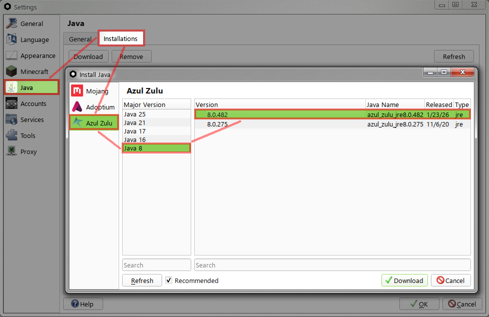 Java: Install Java 8 Azul Zulu [ Settings > Java > Installations > Download > Azul Zulu > Java 8 ]