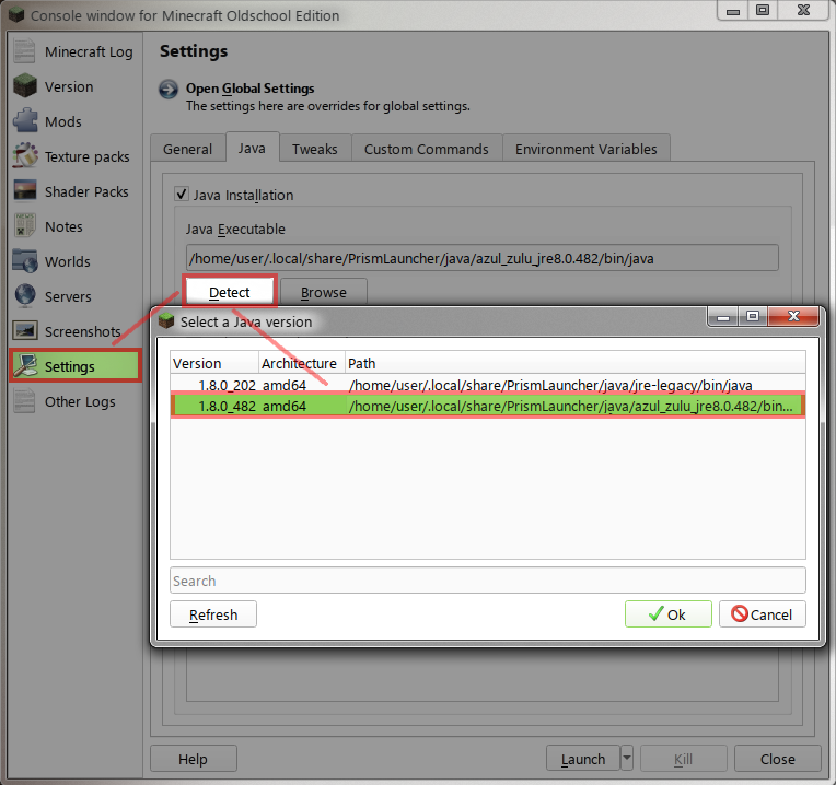 Right click your Minecraft Oldschool instance [ Edit > Settings > Detect > Azul Zulu ]