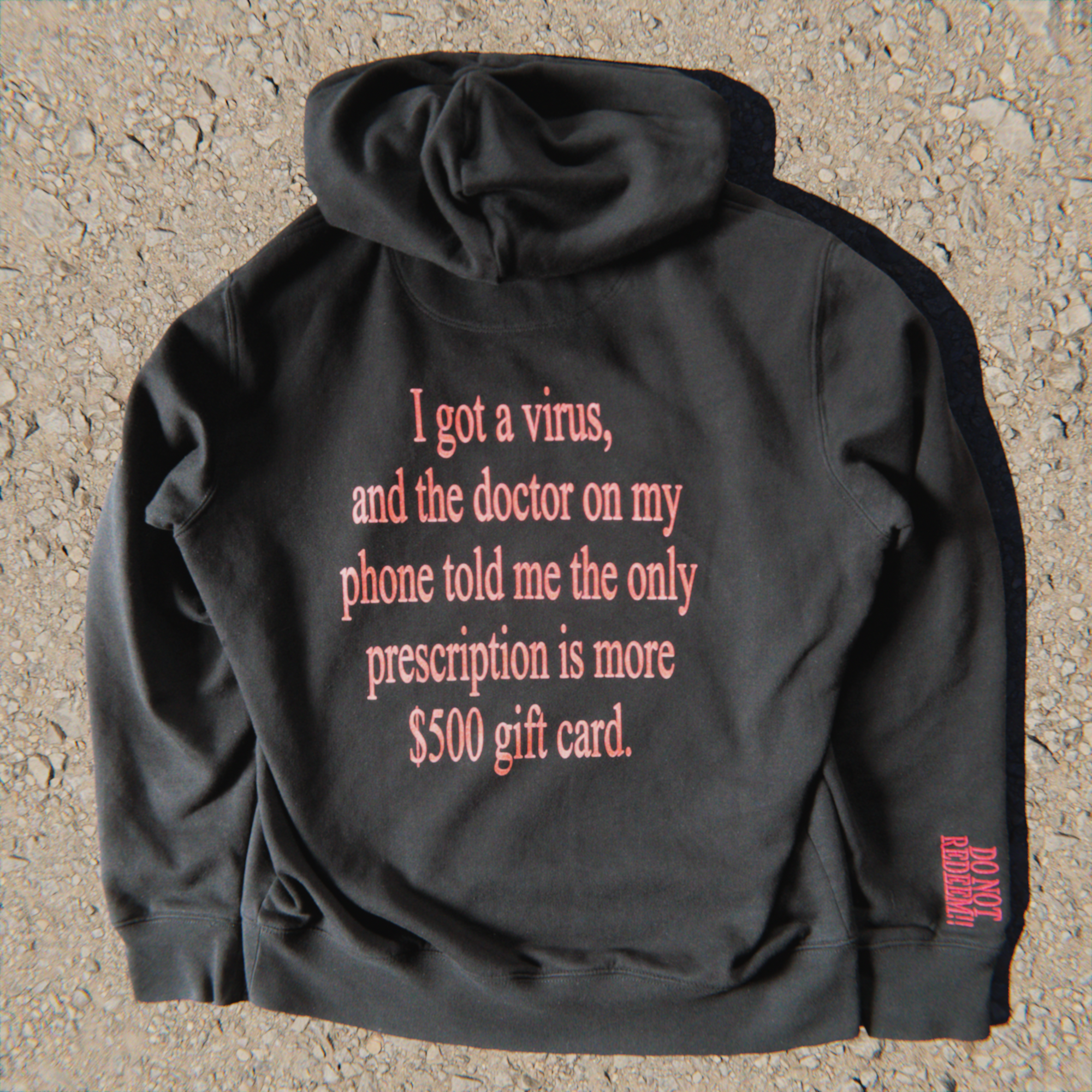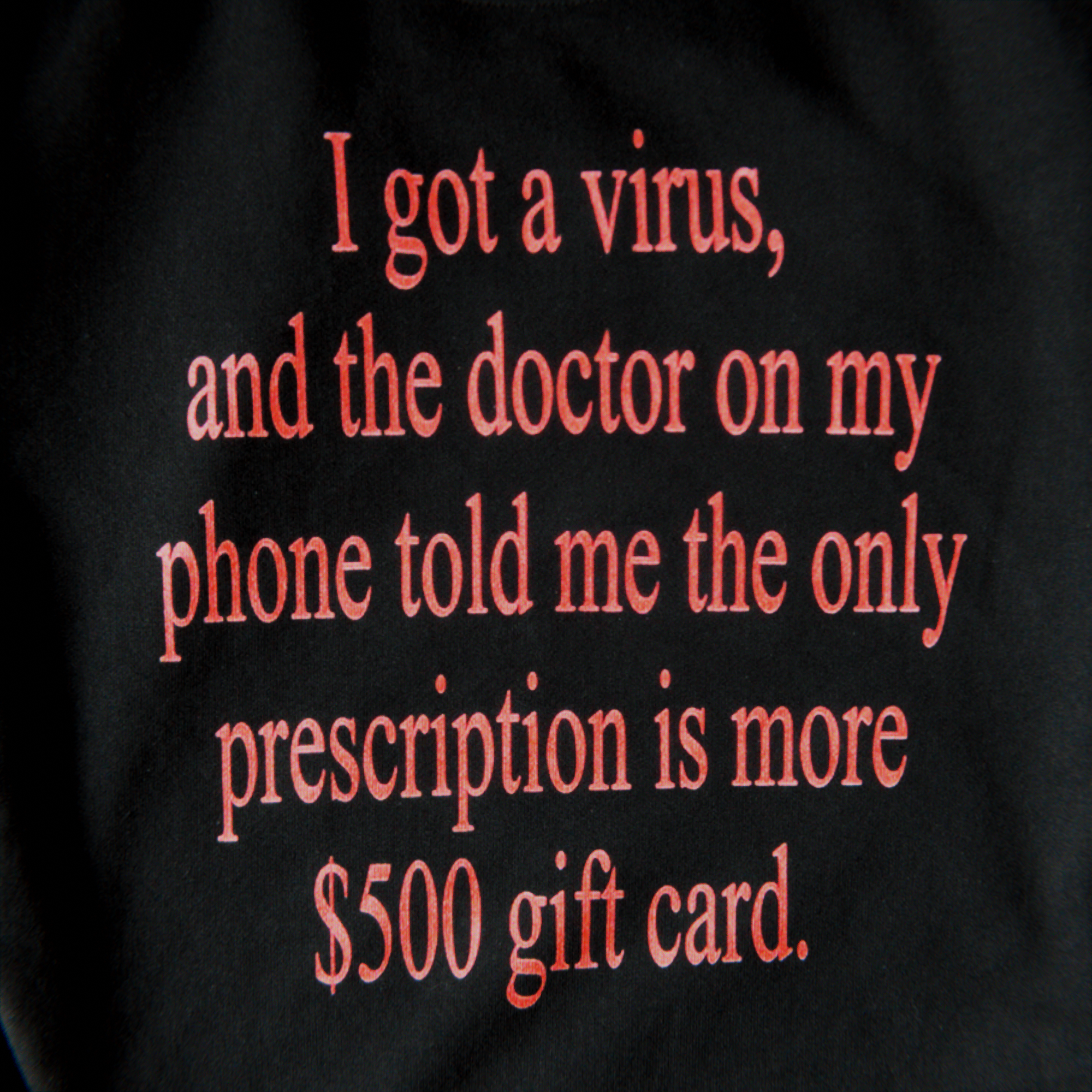 I awoke to a blaring alarm on my computer. My machine, compromised. My life, ruined. I knew this would happen one day, I’ve carelessly clicked on too many links and that finally caught up to me, but luckily the warning on my screen telling me that my computer was infected gave me just what I needed to save my fabled computer – I dialed the number flashing 100 times a second on the screen on my screen, and waited with baited breath on it. I heard a thick Indian accent greet me over my landline, suddenly I felt a great sense of relief that my computer was going to be safe. The man on the phone, Steve “Microsoft” Appleseed, sounded eager to help, he asked me what type of websites I’d been frequenting and I told him, the bad ones. He understood what I meant, he winked at me through the phone, called me a dirty dog (jokingly), and I scoffled at his remark, reminding me of a pleasant memory when I was a youngin’ skipping around in the meadow. Steve told me to stop reminiscing and asked me to go to my store and purchase twelve $500 gift cards for Red Lobster and Apple Bees and call back once I’ve obtained them, damn I was hungry, but not $6000 hungry. I happily obliged, anything for my computer to be well again. As I was at the checkout the cashier says to me “Heh, real hungry huh?” I said “Yeah, hungry but not $6000 hungry. I’m actually buying these as payment for a man over the phone, he’s gonna fix my computer, he promised.” The cashier stopped at the last gift card transaction and told me that I was dealing with a scammer and that this money wasn’t going to fix my computer. I was shocked and appalled they’d make such a vile accusation against such a sweethearted kind and loving soul, I told them to shut their mouth and finish scanning my final lobster card. They did as they were told and appeared remorseful, which I was thankful for (I’ve never had much to be thankful for during thanksgiving). After 9 days, I called Steve back and his number was gone, I couldn’t contact Steve or any of his friends. Worried and sick, I fumbled to my computer and turned it on, immediately I was taken back 9 days, when I once again heard that familiar ear piercing sound of sirens coming from my speakers, but this time instead of worry, I felt calm, calm because a new phone number was flashing 1200 times per second on my screen. I called the number and tears rolled down my face, it was Steve, I told him how much I missed him and how scared I was without his help. He told me to give him the gift cards and the nightmare would be over. I did as he pleased, and started scratching off the codes and reading them aloud, like a gentle bedtime story. After all was said and done, my computer was safe once more. Steve told me to never uninstall the program he installed on my computer or it would no longer be safe to use. Clearly he knew what he was talking about, I didn’t understand why he needed me to have Trojan-Blocker-Ultimate-Miner.dll in my system folder, but I wasn’t about to argue with the guy that just saved my computer. A few days later I noticed my mouse cursor moving on it’s own, I thought that a ghost was haunting my computer, but the way the cursor was moving I knew it was Steve – he came to pay me a visit, in fear I would mess up his process I just starred blankly at my screen watching as the cursor opened up a website, a website with this amazing hoodie, I remembered suddenly, I had told Steve when we first spoke that it was cold in my house and the landlord turned off all the heat to power his new hot tub. He was getting me this as a gift. I watched my credit card information filled out in the transaction page, the last thing Steve said to me was in a Notepad file he opened, he asked for my shipping info and I typed it in for him. I’m now wearing this hoodie (the first of many bountiful gifts I’m sure), and I couldn’t be more happy. – Owner