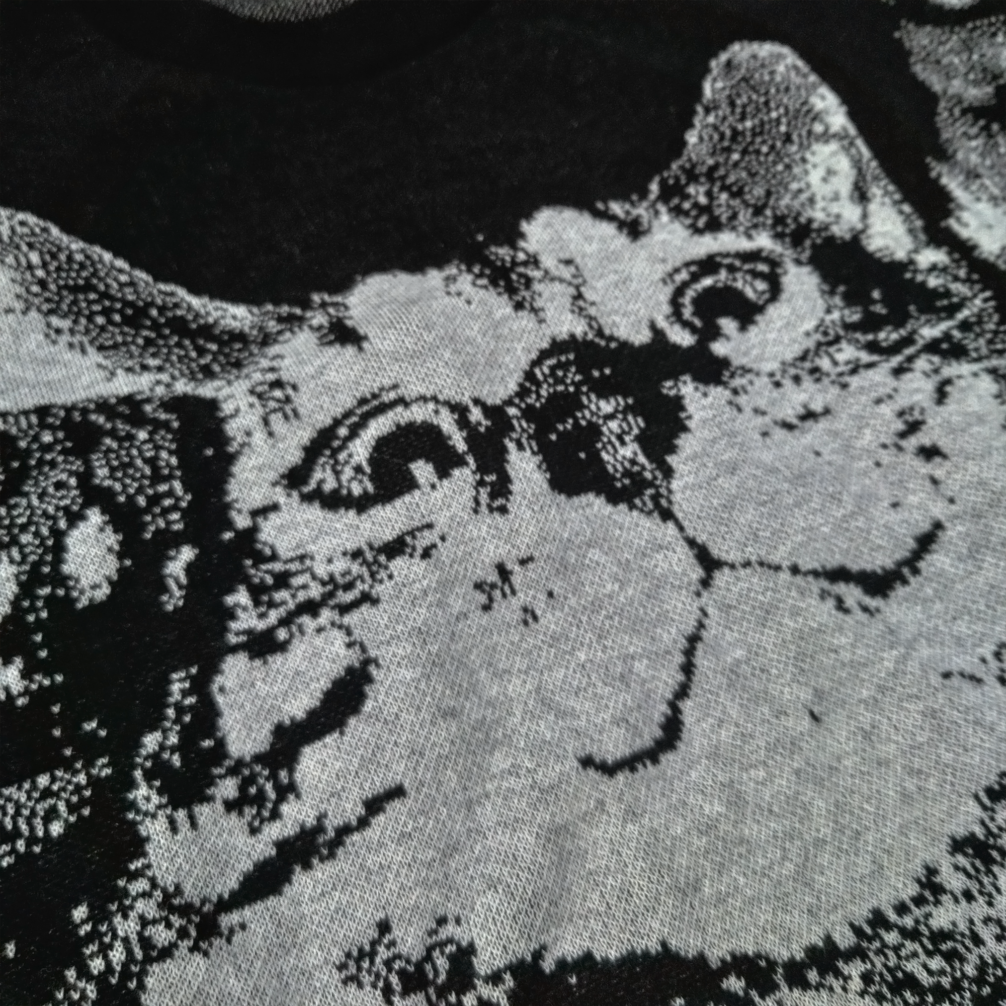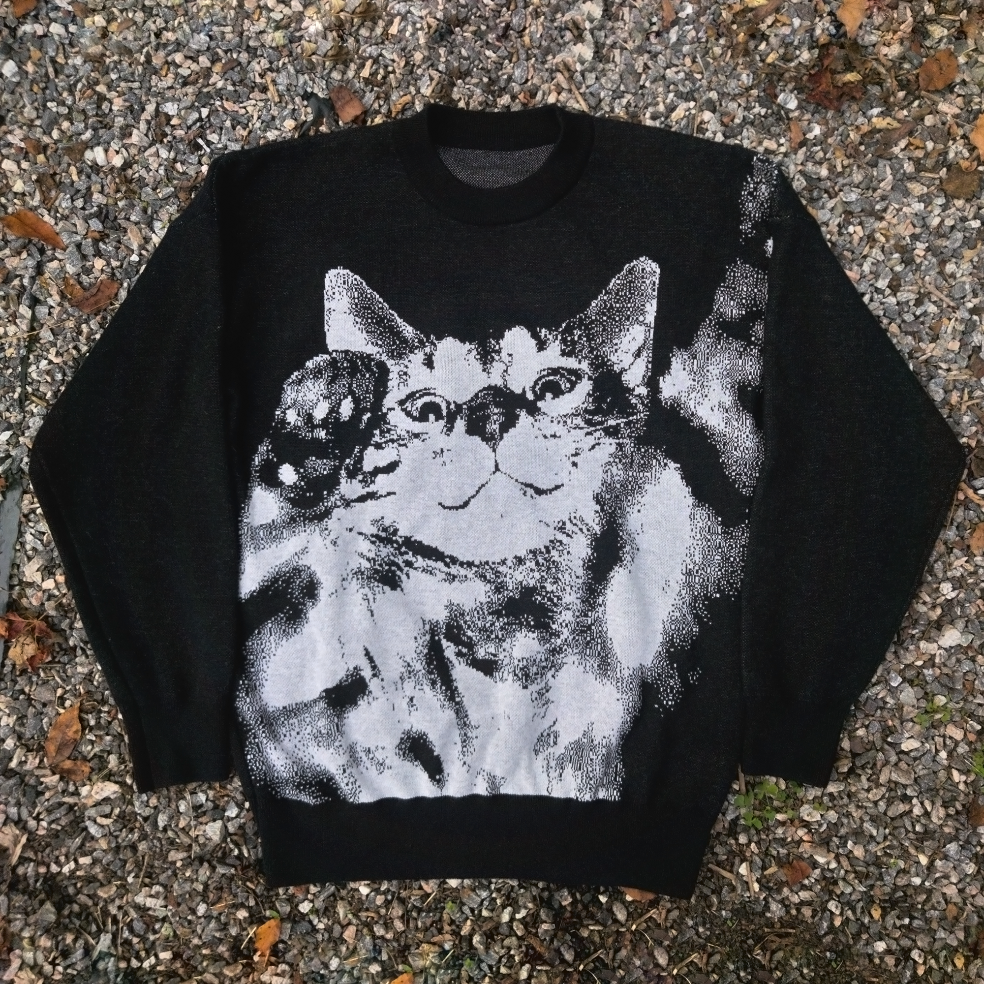 My regular wife of whom I met, was starting to grow more distant and spent less time at home, and more time at her “vacation house” by The Keyes. We’d been training our little cat for the biggest cat show of the year and she wasn’t putting in the effort needed to win even a fucking bronze medal. I feared all our effort (mostly mine) would be for FUCKING NOTHING. At least I had my little cat that promised to never leave. One day I noticed my wife hadn’t been home in 3 weeks and she had our cat, this was not like her. I attempted to call her but it went straight to voice, the big competition was nearly a month away and without a cat and my wife, I knew I wouldn’t win any big trophy. Before panic completely swallowed me whole, I was abruptly startled by a knocking on my door. When I opened it, I looked down and my wife was there, but she was different, she was on all fours and had furry skin and sharp claws. “What happened to you, my wife?” I said to myself in absolute terror, she looked up at me with those big bright beautiful eyes I fell in love with, “Am I really about to do what I think about to do with this fucking cat?!” I said loudly, loud enough for her to hear, she began talking to me which sent me into shock. She said that she put herself in the cat’s body so I would finally pay attention to her, since I was always hanging out with our cat instead of her. I told her we had no time to waste, we needed to train for the big cat show! After a month straight of strenuous training we entered into the competition and won first in show. My wife unfortunately was struck by a car and fell ill from the ambulance ride back, I was saddened by this, my heart was aching, until.. I realized my wife’s normal human body was still out there, presumably at the “vacation house”, so I told the ambulance driver to hang a right and drive to The Keyes. When we arrived I quickly found her normal body and asked the witch doctor (Dr. Illegitimate PhD) to perform a body morph spell on my wife. With a tap of his chicken head stick, my beautiful wife was back in her normal body, and our cat was okay indefinitely. Before he left, the witch doctor remarked that our cat looked familiar, said it looked just like the one on this website. Out of curiosity I bought this sweater to confirm, and it does look similar. – Owner